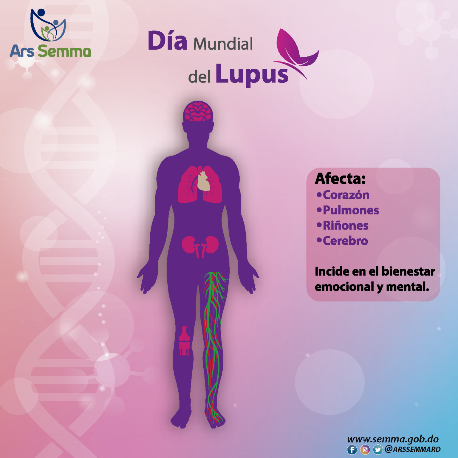 El color violeta y el símbolo de la mariposa son los elementos que representan el 10 de mayo como la fecha que conmemora el Día Mundial del Lupus, establecido a partir de la celebración del VII Congreso Internacional de Lupus Eritematoso Sistémico y otras Enfermedades Relacionadas, en la ciudad de Nueva York en el año 2004.